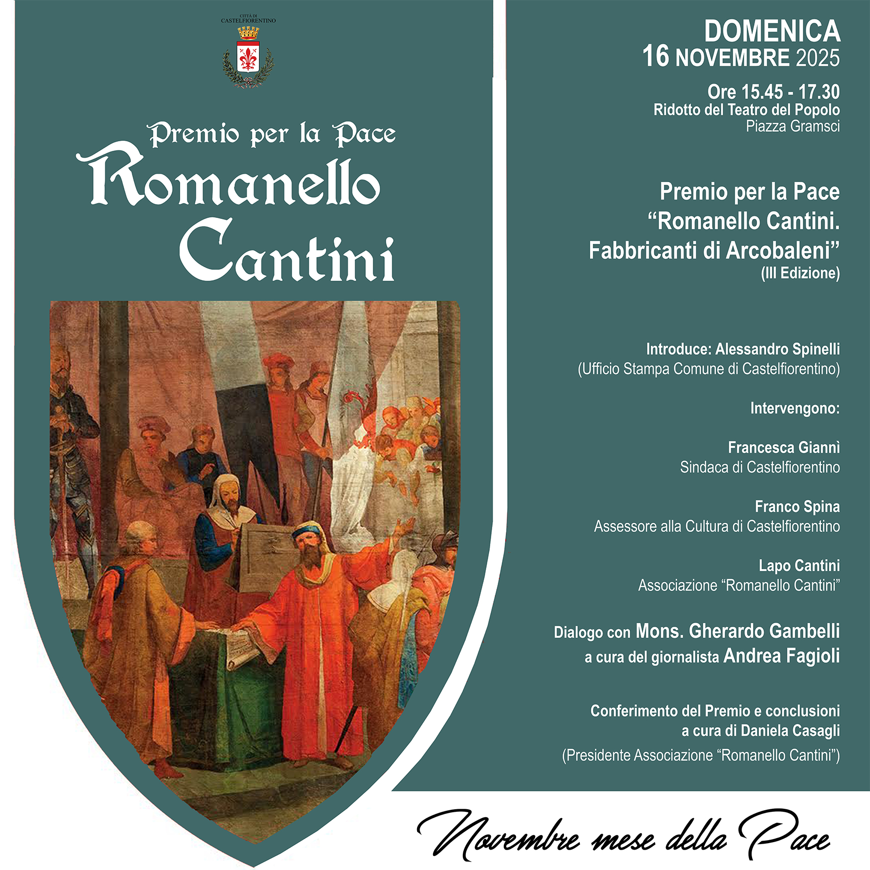 “La figura culturale e morale di Romanello Cantini – sottolinea l’Assessore alla Cultura, Franco Spina - con il lascito del suo pensiero e dei suoi scritti, rivive ancora a Castelfiorentino, con la 3° edizione del Premio a lui dedicato, quest'anno assegnato a Mons. Gambelli, operatore di Pace nel Ciad. Siamo felici di portare avanti, insieme all'associazione nata in suo nome, la Cultura della Pace, come testimonianza concreta a cui tendere nel quotidiano. La cultura della Pace parte dalle storie individuali, dal piccolo di ognuno di noi, dai "ponti" che edifichiamo tra le diversità, nel pieno rispetto della nostra e dell'altrui libertà. Perché iniziare a "fabbricare arcobaleni" può e deve essere il nostro compito nel mondo”.