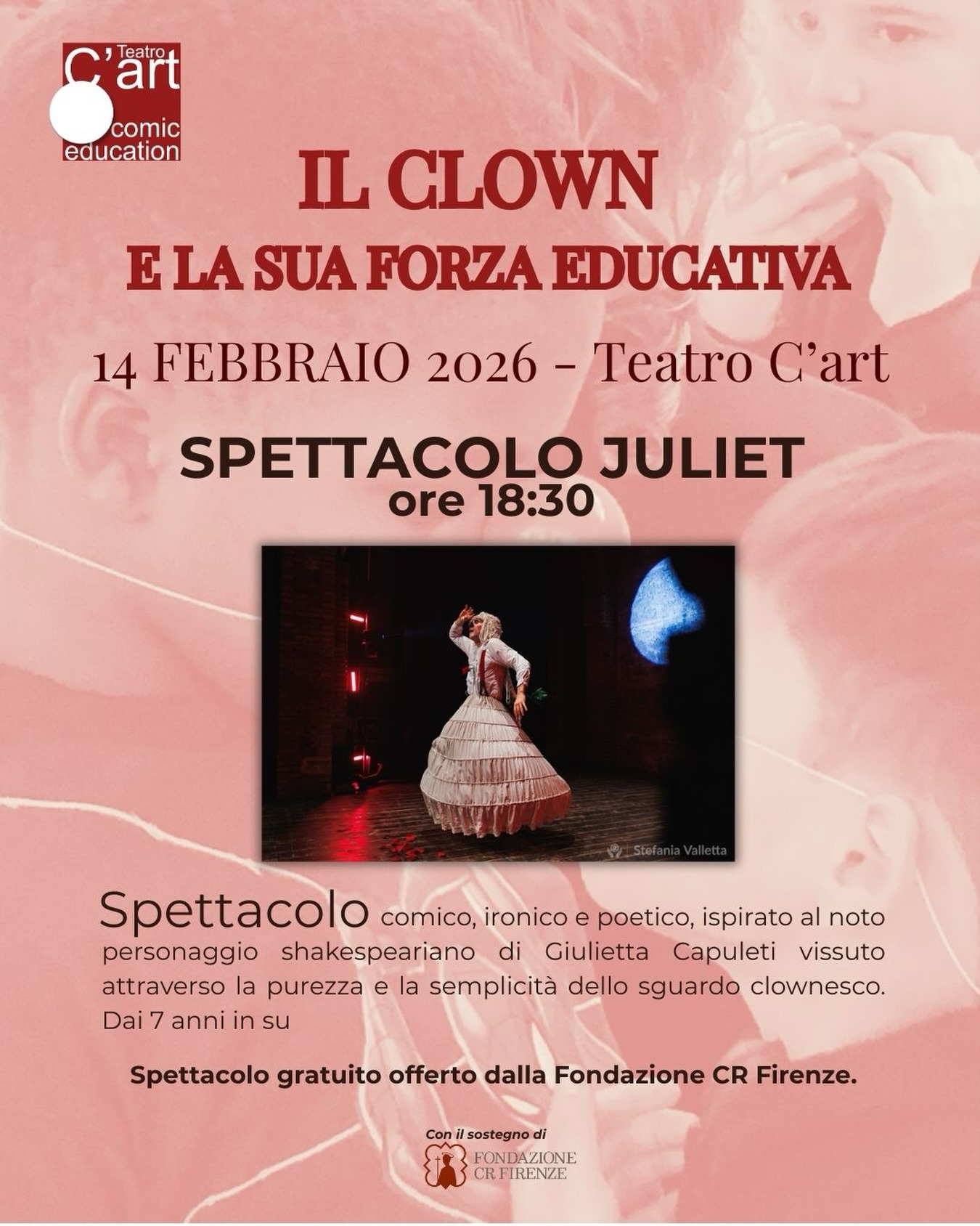 Conclusione in serata (18.30) con lo spettacolo “Juliet” di e con Stefano Marzuoli. Uno spettacolo comico, ironico e poetico, ispirato al noto personaggio shakespeariano di Giulietta Capuleti, vissuta attraverso la purezza e la semplicità dello sguardo clownesco (dai 7 anni in su). Lo spettacolo è gratuito ed è offerto dalla Fondazione CR Firenze. Prenotazioni a partire dal 7 febbraio su piattaforma Fondazione CR Firenze a questo link https://fondazionecrfirenze.it/la-fondazione-per-te/#prenota-evento.