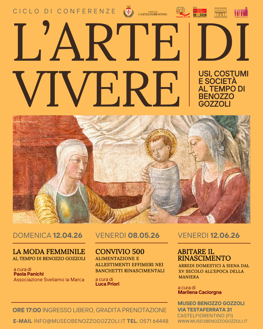 Tutti gli incontri si terranno presso il BeGo – Museo Benozzo Gozzoli, in via A. Testaferrata 31 a Castelfiorentino. L’ingresso è libero; è gradita la prenotazione via e-mail (info@museobenozzogozzoli.it) o telefonando, in orario di apertura, al numero 0571 64448.