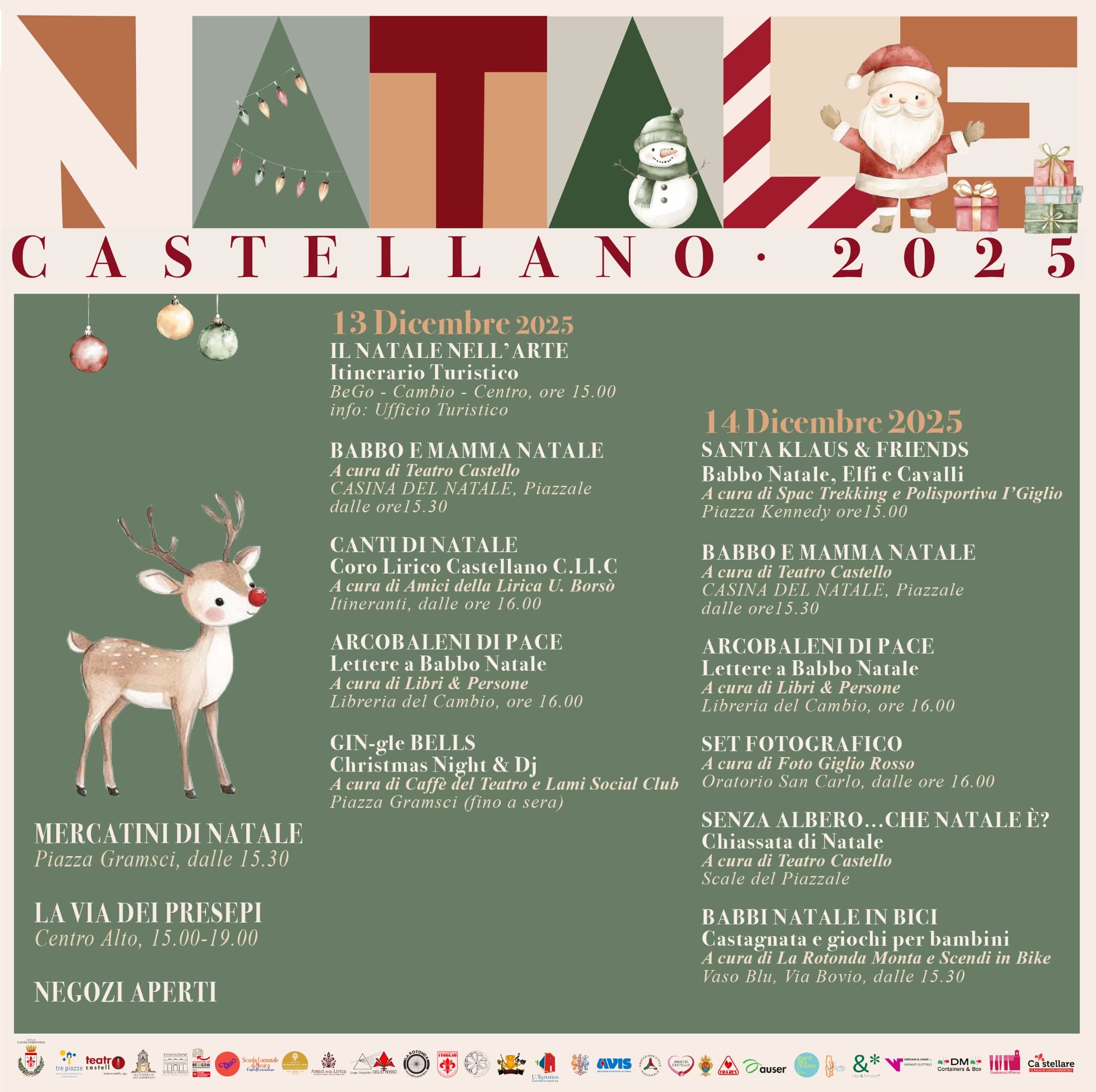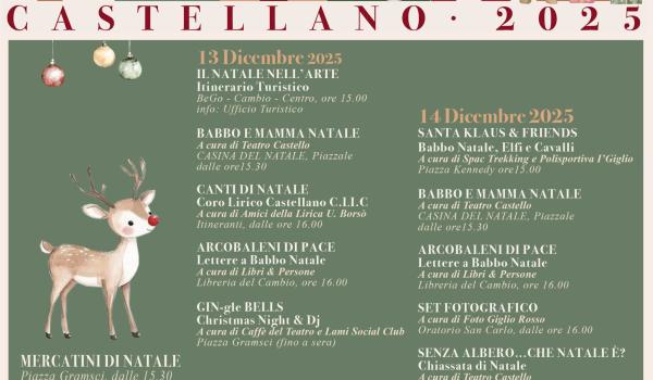 Si comincia dunque sabato pomeriggio (ore 15.00) con un itinerario artistico tra il Museo Be.Go. il Centro Culturale Cambio e le vie del centro mentre alle 15.30, in concomitanza con l’apertura del mercatino natalizio, ci sarà anche la Casina di Babbo Natale per la gioia di tutti i bambini, con possibilità di scattare una suggestiva foto-ricordo. Dalle 16.00 prenderanno il via per le vie del centro (itineranti) i “Canti di Natale” del Coro Lirico Castellano”, mentre alla Libreria del Cambio (corso matteotti, aperto anche domenica pomeriggio) una iniziativa originale: “Arcobaleni di Pace”, laboratorio di scrittura creativa per bambini. I piccoli partecipanti potranno scrivere delle letterine dedicate al tema della Pace: desideri personali, ma anche sogni e richieste per un mondo più giusto e sereno. Durante tutto il periodo natalizio, i bambini potranno imbucare le lettere nella cassetta di posta all’ingresso della libreria, e le più belle avranno la gioia di essere pubblicate in un libro edito da Federighi editori che sarà distribuito in tutta Italia. In Piazza Gramsci, infine, “Jingle-Bells. Christmas night e Dj”, iniziativa a cura di Caffè del Teatro e Lami Social Club che si protrarrà fino a sera.