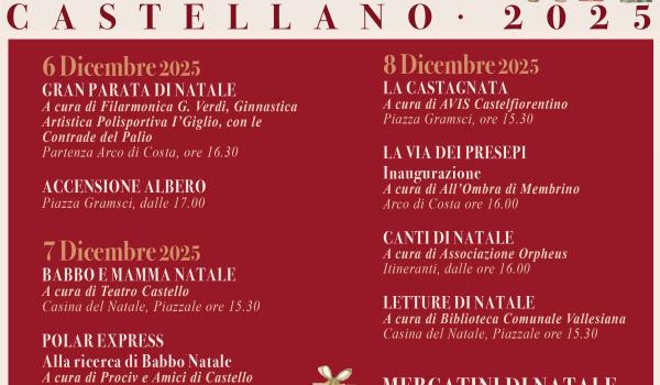 Lunedì 8 dicembre, sempre nel pomeriggio, tradizionale castagnata in Piazza Gramsci, il suggestivo mercatino di Natale arricchito da “letture” natalizie presso la “Casina” di Babbo Natale, Canti di Natale itineranti per le vie del centro e, alle 16.00, l’inaugurazione del percorso “Via dei Presepi” (partenza da Arco della Costa), con oltre 40 presepi artistici e originali disseminati nel centro storico alto, alcuni davvero innovativi per creatività e ingegno tecnologico. Per scoprirli e ammirarli uno a uno è disponibile anche una mappa sul sito www.comune.castelfiorentino.fi.it e sulla pagina FB “La via dei Presepi a Castelfiorentino”.