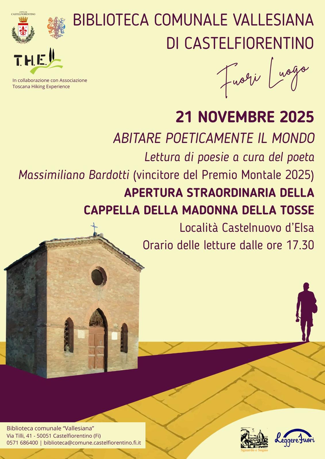 Promossa dalla Biblioteca Comunale “Vallesiana” nell’ambito di “Fuori luogo”, rassegna di narrazioni itineranti che quest’anno interessano il territorio aperto, l’iniziativa è aperta a tutti (ingresso gratuito), e consentirà ai partecipanti di scoprire uno dei piccoli “gioielli” del patrimonio storico artistico recuperati di recente, oltre ad apprezzare i versi di uno dei poeti di Castelfiorentino che si sono particolarmente distinti per la sua sensibilità, religiosa e spirituale.