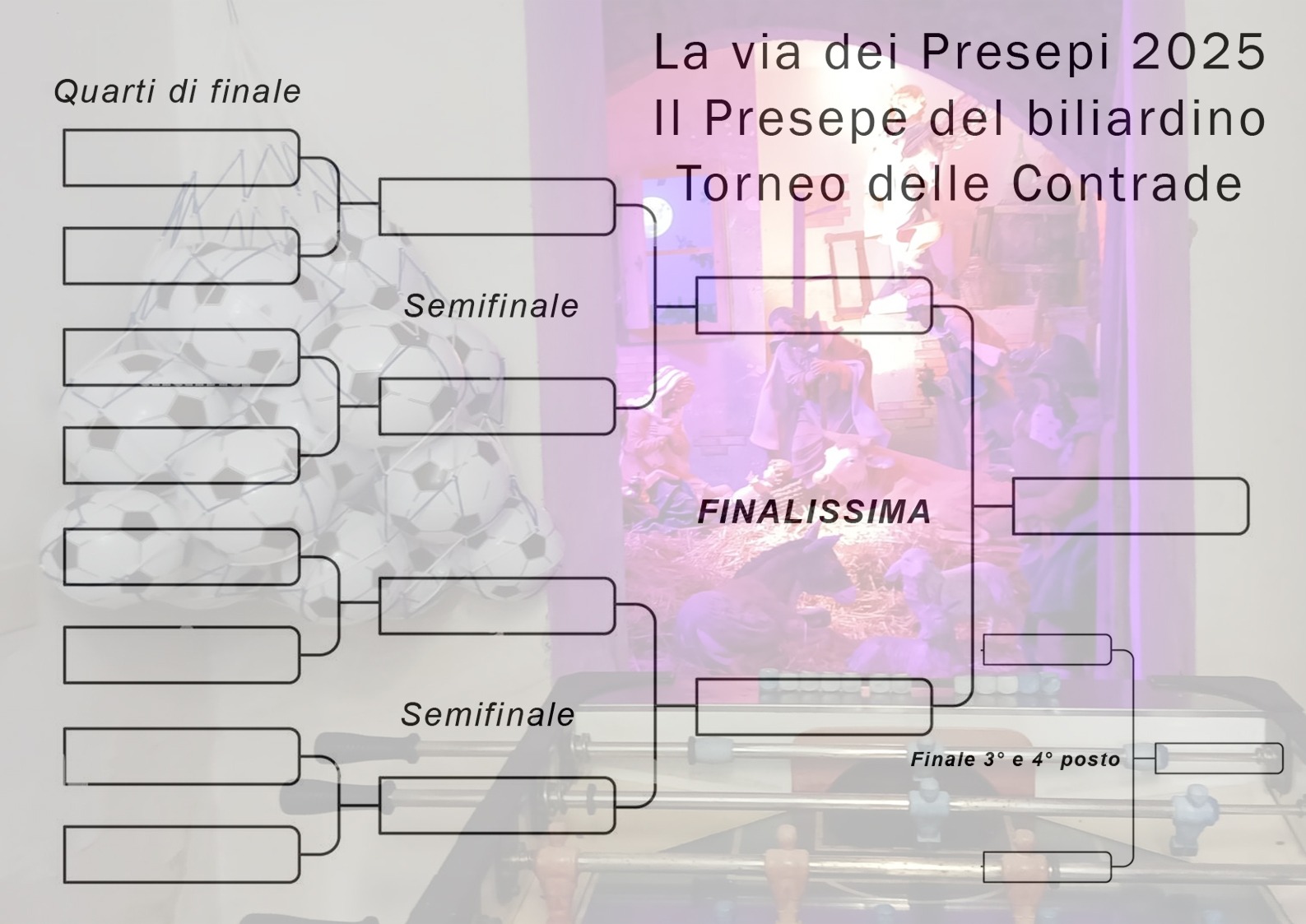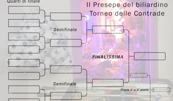 In corsa per aggiudicarsi il torneo otto squadre (che corrispondono alle contrade del Palio) composte ciascuna da due giocatori, le quali disputeranno i quarti e le semifinali nei due biliardini dove non è presente il meccanismo che illumina il presepe, mentre per le finali 3° e 4° posto e la finalissima saranno disputate nel biliardino dove è stato installato questo piccolo “segreto tecnologico”, un gioiello concepito grazie alla creatività dei presepisti dell’Associazione “All’Ombra di Membrino”.