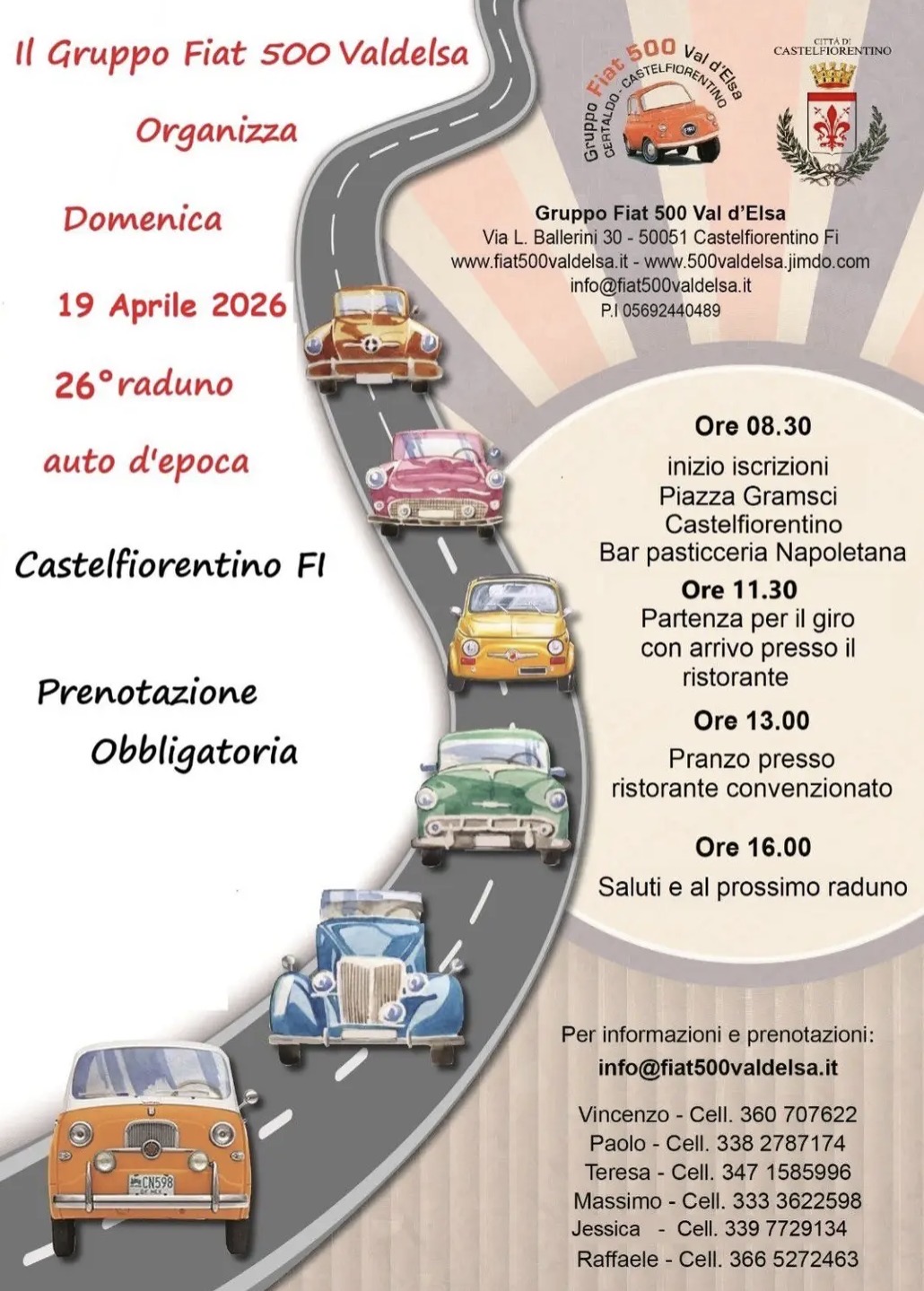 Domenica 19 aprile (dalle 8.30) raduno in Piazza Gramsci promosso dal Gruppo “Fiat 500” Valdelsa. Nel pomeriggio il centro cittadino sarà animato da “Castello di Giochi”