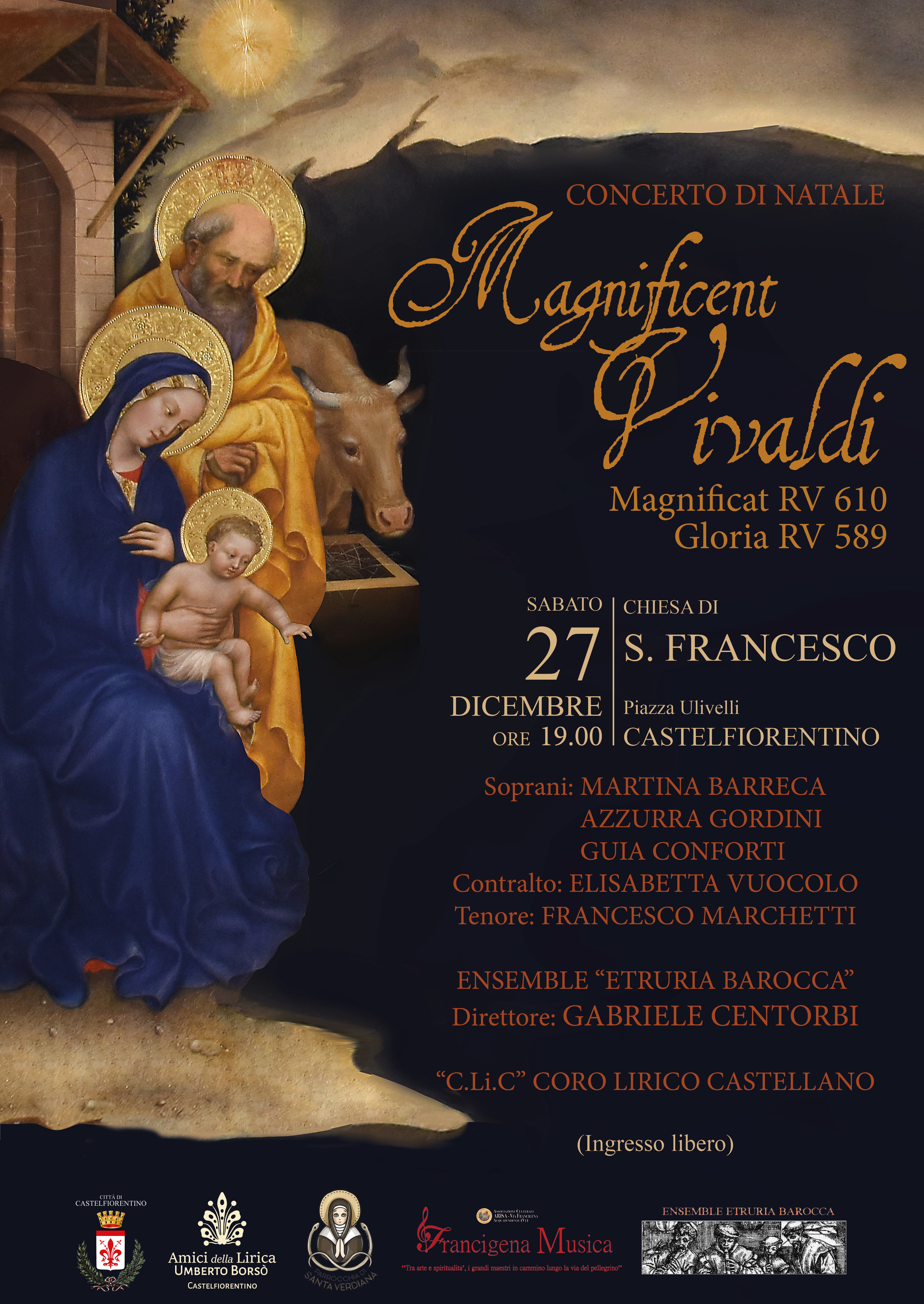Un concerto di Natale dedicato ad Antonio Vivaldi, uno dei più illustri esponenti del barocco musicale. E’ questa la proposta dell’Associazione “Amici della Lirica Umbertp Borsò” che sabato 27 dicembre (ore 19.00) organizza alla Chiesa di San Francesco una serata incentrata su due capolavori del famoso compositore che meglio incarnano la spiritualità dell'avvento e del Natale, ossia Il Magnificat RV 610 e il Gloria Rv 589, oltre ad alcuni brani tradizionali del Natale.
