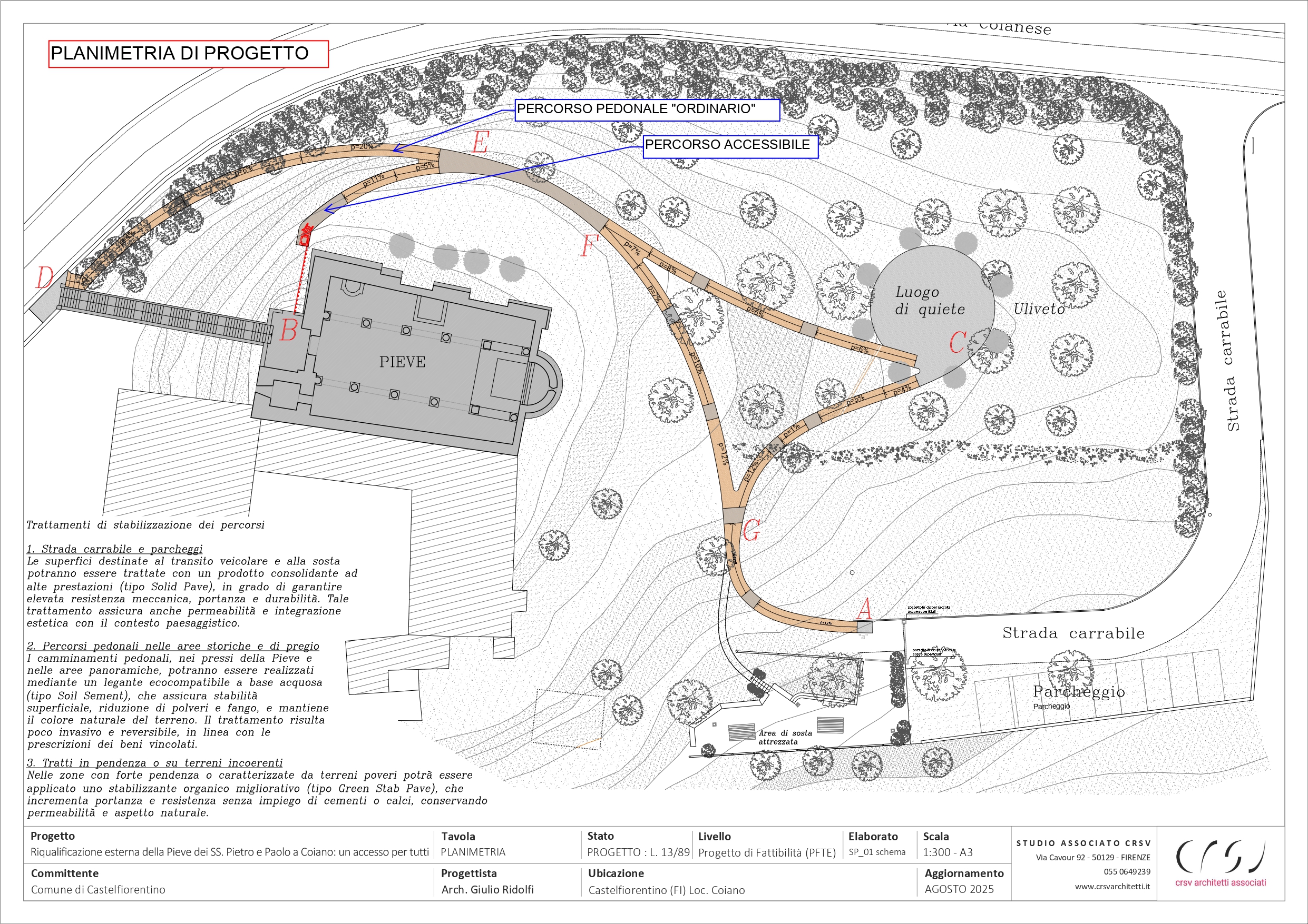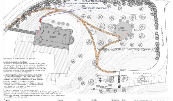 Contestualmente, il Comune di Castelfiorentino (che in virtù di un contratto di comodato aveva già realizzato un parcheggio e una sosta attrezzata per i turisti) ha avviato le fasi progettuali per la riqualificazione dell’area esterna, attraverso un confronto con la Sovrintendenza cui spetta – essendo l’area sottoposta come la Pieve a vincolo monumentale – un’autorizzazione preventiva. Il nuovo progetto, per una spesa preventivata di 230.000 euro (di cui 115.000 sostenuti dalla Fondazione CR Firenze) prevede la realizzazione di due percorsi pedonali, interni al Parco, che consentiranno a coloro che usufruiscono del parcheggio o dell’area di sosta attrezzata di raggiungere agevolmente la scalinata oppure – nel caso di persone con ridotte o impedite capacità motorie – direttamente il portone di ingresso della Pieve, utilizzando a tal fine un servoscala. In entrambi i percorsi ci sarà la possibilità di fruire di una deviazione verso un “luogo di quiete”, a forma circolare e in mezzo all’oliveta, per offrire un’opportunità di riposo, di raccoglimento e di riflessione. Il parco sarà infine riqualificato con una più ordinata sistemazione delle specie arboree e arbustive, al fine di valorizzare la percezione visiva di tutto il complesso monumentale. L’intero intervento sarà completato nella primavera 2027.