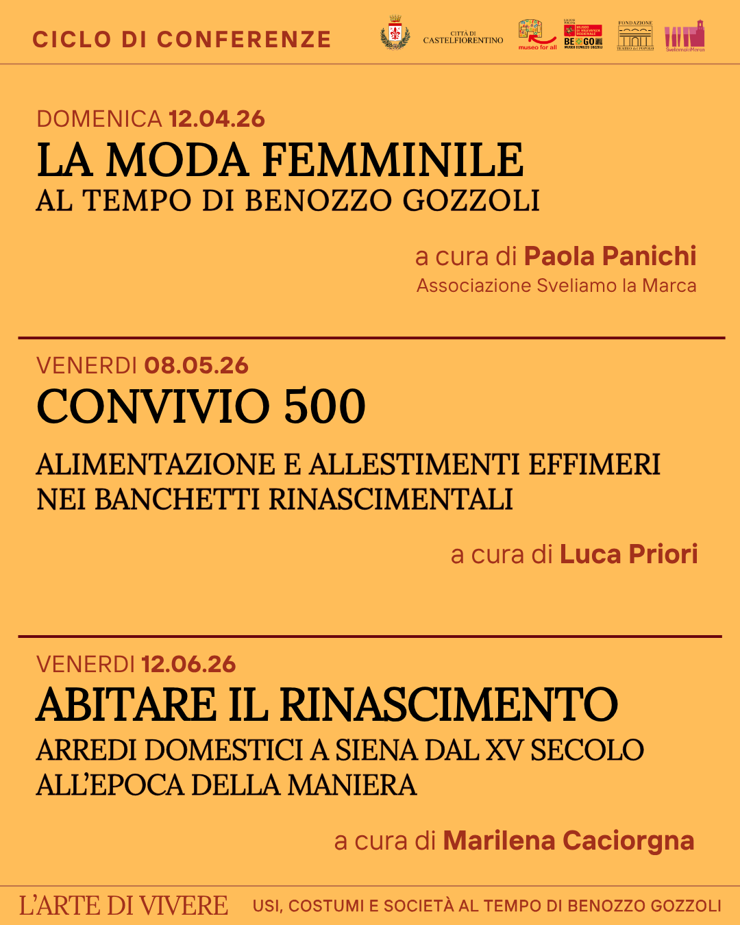 Attraverso una serie di approfondimenti tematici, il ciclo intende restituire uno spaccato vivido della vita quotidiana nel Rinascimento, prendendo le mosse dagli affreschi dei due tabernacoli realizzati da Benozzo Gozzoli e conservati al BeGo, preziosa testimonianza figurativa delle tradizioni diffuse nella società del periodo.
