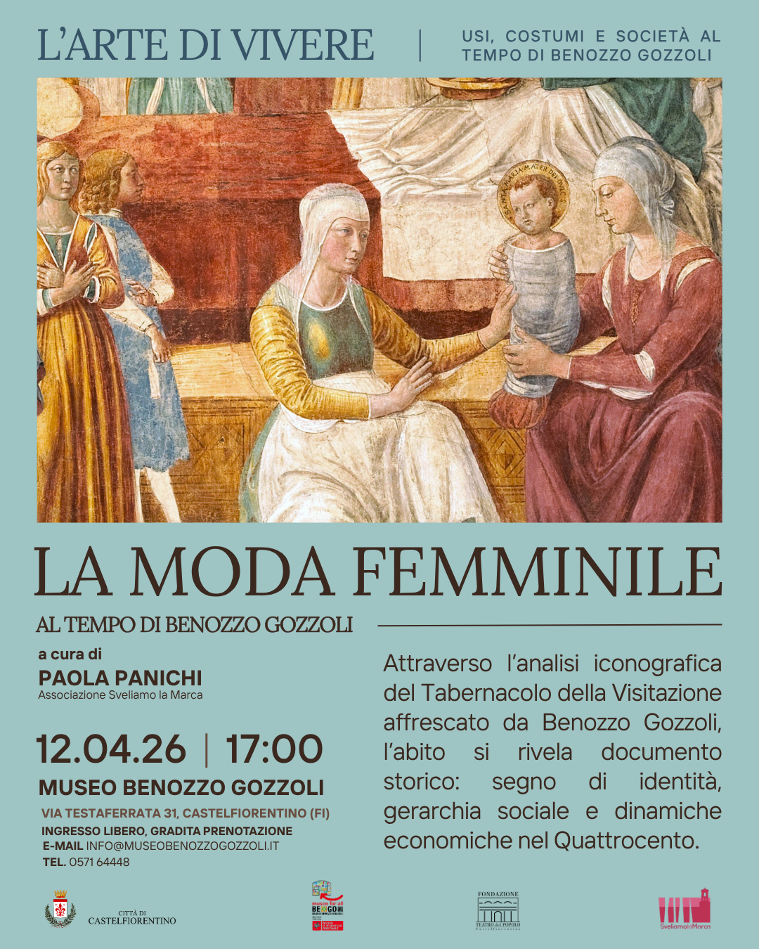 Il primo appuntamento è in programma domenica 12 aprile, alle ore 17.00, con “La moda femminile ai tempi di Benozzo Gozzoli”, a cura di Paola Panichi dell’Associazione Sveliamo la Marca, organizzazione attivamente impegnata da molti anni nella valorizzazione del patrimonio artistico castellano. L’incontro offrirà uno sguardo approfondito sull’abbigliamento femminile nel Quattrocento, tra eleganza, simbolismo e codici sociali: tessuti preziosi, indumenti e accessori non erano soltanto espressione di gusto estetico, ma veri e propri indicatori di status, appartenenza e identità. Attraverso il confronto con le raffigurazioni presenti negli affreschi di Benozzo Gozzoli, sarà possibile ricostruire usi e consuetudini legati al vestire, cogliendo il dialogo tra moda, società e rappresentazione nella cultura rinascimentale.