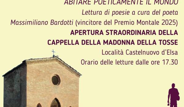 La Cappella della Madonna della Tosse, il sito che si trova a valle di Castelnuovo d’Elsa e che originariamente ospitava l’omonimo affresco realizzato da Benozzo Gozzoli, apre in via del tutto straordinaria le sue porte. E lo fa con una serata interamente dedicata alla poesia di Massimiliano Bardotti, vincitore del Premio Montale 2025 con la sua ultima raccolta “A noi basti la gioia di cantare”.